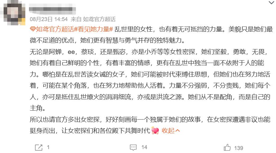 比如《如鸢》在线联合新浪新闻发起#看到她的实力#话题征集活动,也在变相强调女性作为主体的实力,引导玩家体验女性的多样性。