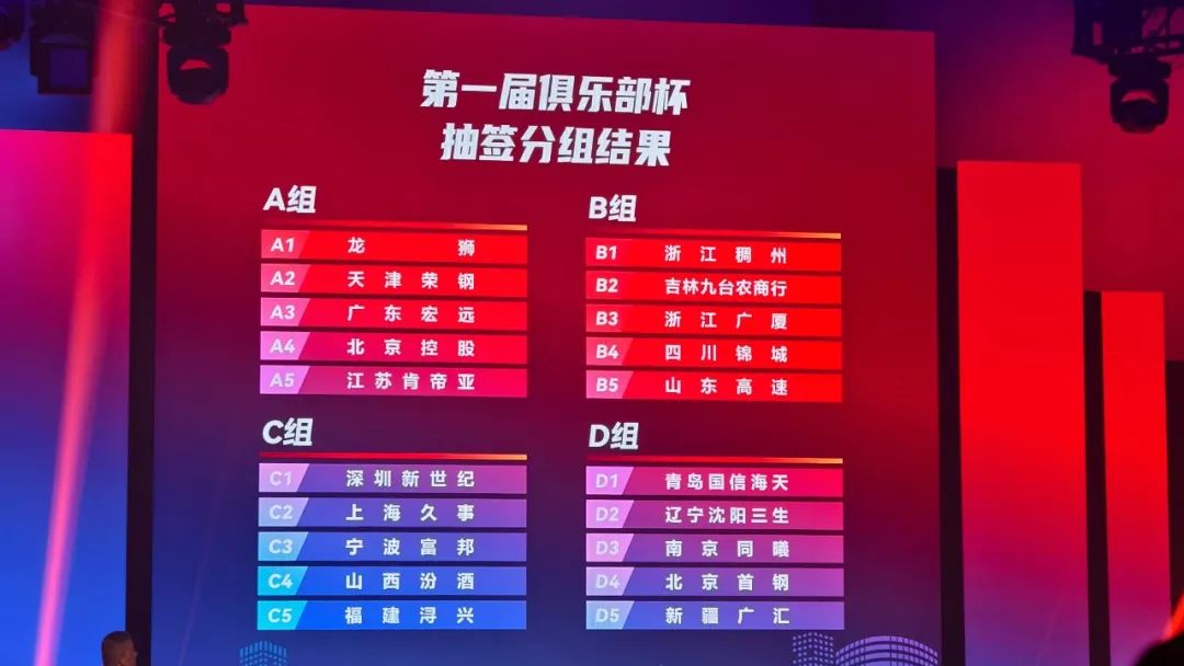 在新闻发布会上,首届CBA俱乐部杯举行了抽签分组仪式。其中,广州、天津、广东、北京控制、江苏在A组;浙江、吉林、广厦、山东、四川位于B组;C组位于深圳、上海、宁波、山西和福建;D组位于青岛、辽宁、同曦、北京和新疆。