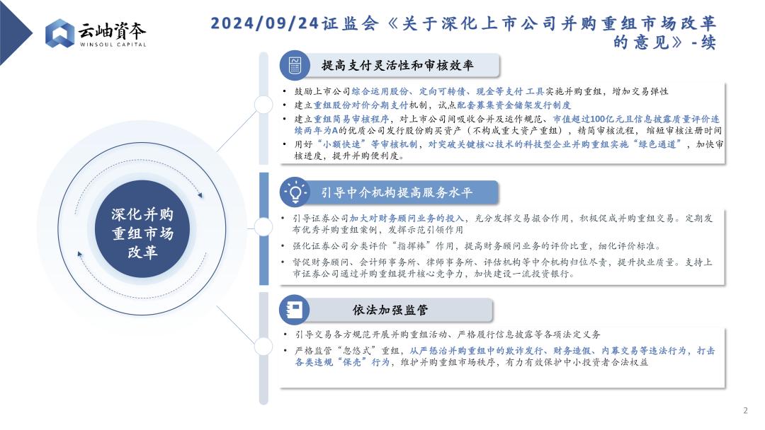 M&A是支持经济转型升级、实现高质量发展的重要市场工具。自去年底以来,中国证监会陆续出台了多项政策,对M&A市场进行了重要部署。为了进一步激发M&A市场的活力,9月24日,中国证监会发布《关于深化上市公司并购市场改革的意见》(简称“并购六条”)。主要内容如下: