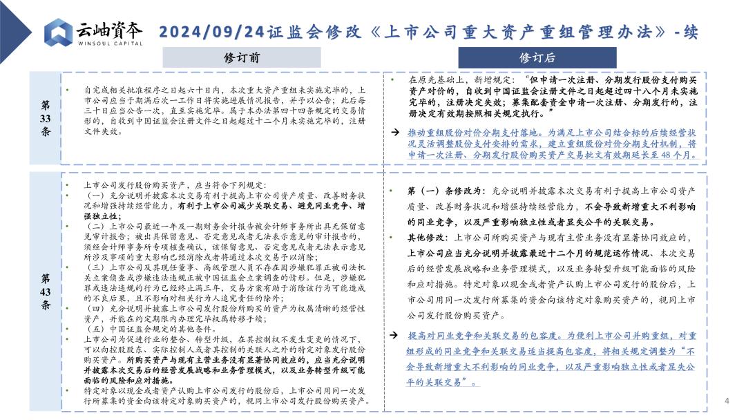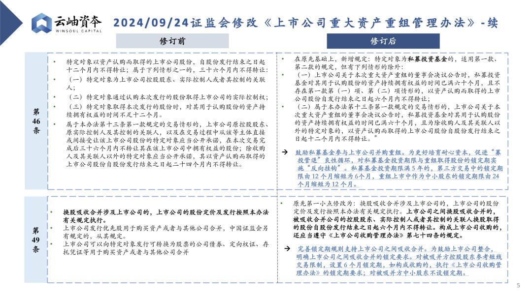 为了实施“并购六条”,中国证监会和证券交易所修订了《上市公司重大资产重组管理办法》(以下简称《重组办法》)等规则。修改主要包括:鼓励私募股权基金参与上市公司并购重组,对私募股权基金的投资期限和获取股份的锁定期实施“反向挂钩”;明确简单的审核程序细则;促进股权对价分期支付重组;提高对行业竞争和相关交易的容忍度;支持上市公司吸收合并等。