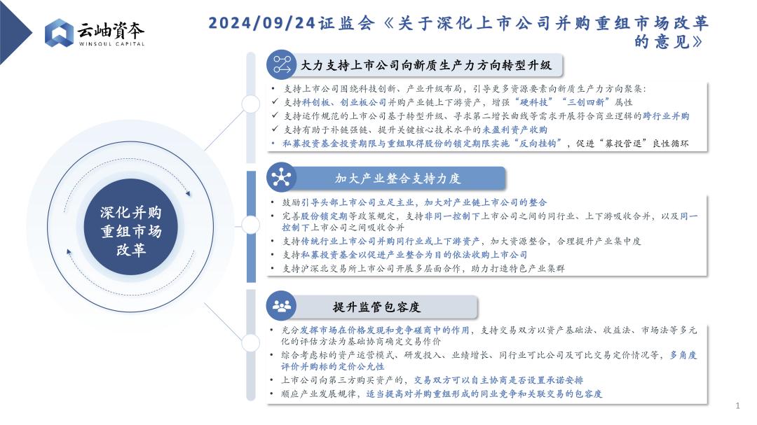 伴随着一系列扶持政策的不断实施,国内并购市场不断升温。9月24日,中国证监会发布《关于深化上市公司M&A市场改革的意见》(以下简称《M&A六条》),相应修订《上市公司重大资产重组管理办法》(以下简称《重组办法》),系统放松中国M&A市场,大力提升M&A市场活跃度。为了探索并购重组市场的未来机遇,本文将对“并购六条”和“重组办法”进行解读和分析。