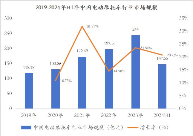 2024年上半年,全国电动摩托销量达到163.28万台。据统计,2019年中国电动摩托业市场规模为118.18亿元,2024年中国电动摩托业市场规模为147.55亿元,同比增长20.73%。2019-2024年中国电动摩托业市场规模如下: