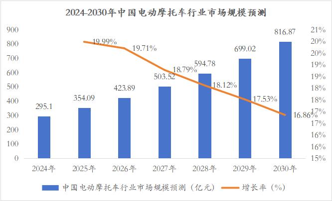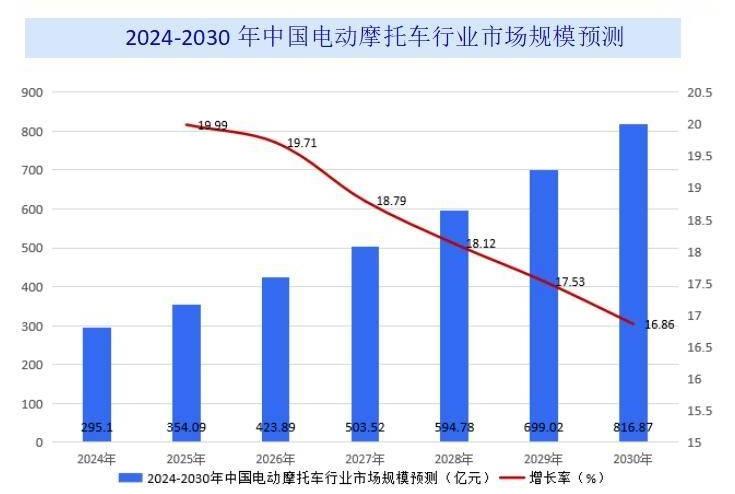 2024-2030年中国电动摩托业市场规模增长16.86%-20.73%,2030年中国电动摩托业市场规模增长816.87亿元,同比增长16.86%。2024-2030年中国电动摩托业市场规模预测如下: