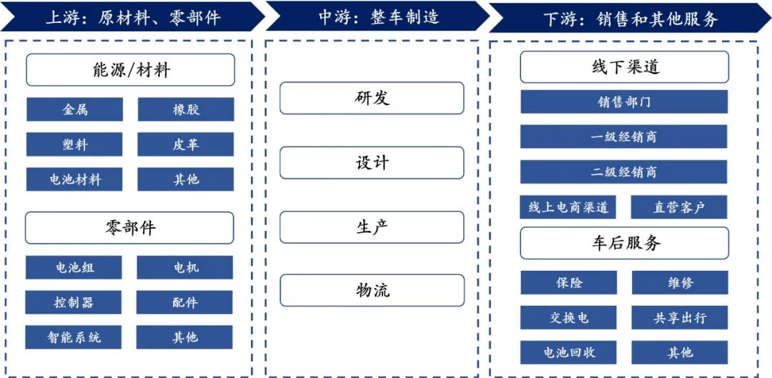 电动摩托车的构成与电动自行车基本一致,由电气系统、操作系统、装饰部件、车身部件和后续部件组成。电动摩托车的产业链紧密相连,涵盖了从上游原材料供应到中游制造再到下游销售服务的全面阶段。