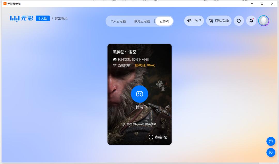 此外,无影云计算机的客户端除了个人云计算机和家庭云计算机的选项外,还为云游戏提供了额外的渠道。只要你在steam上买了黑悟空,就可以一键配备,打开秒玩。
