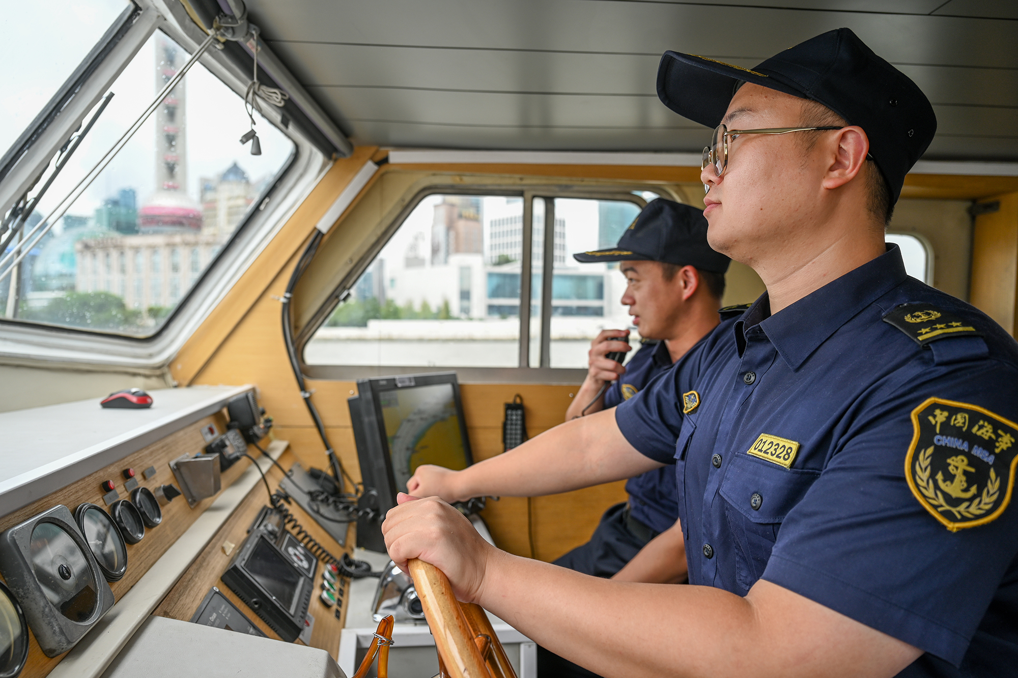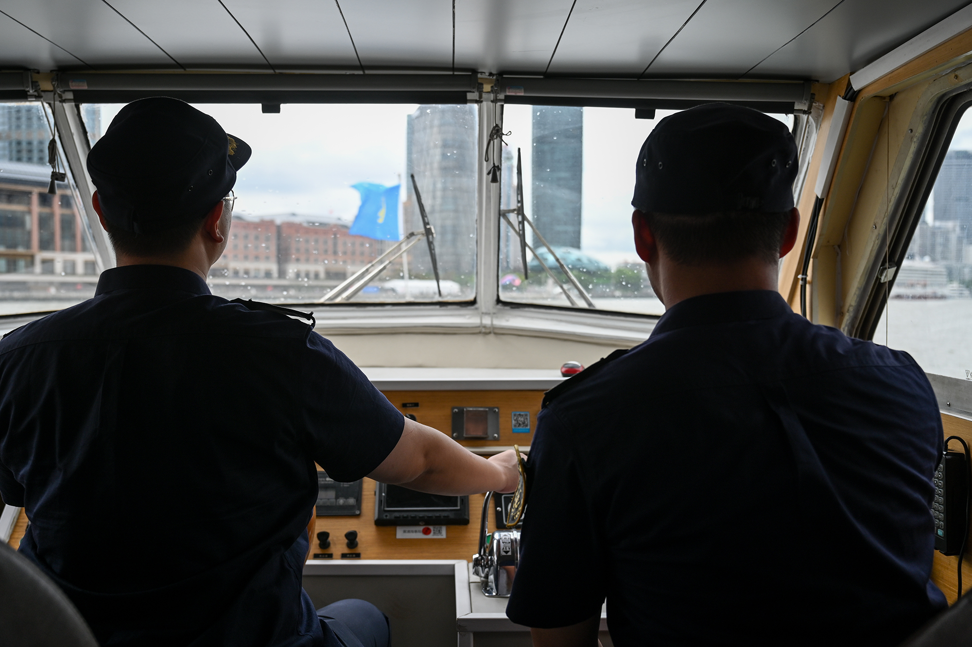 上海、黄浦海事稽查人员鲁一帆(右一)和林源新于2024年9月26日在辖区内巡查护航。本报记者 朱伟辉 图