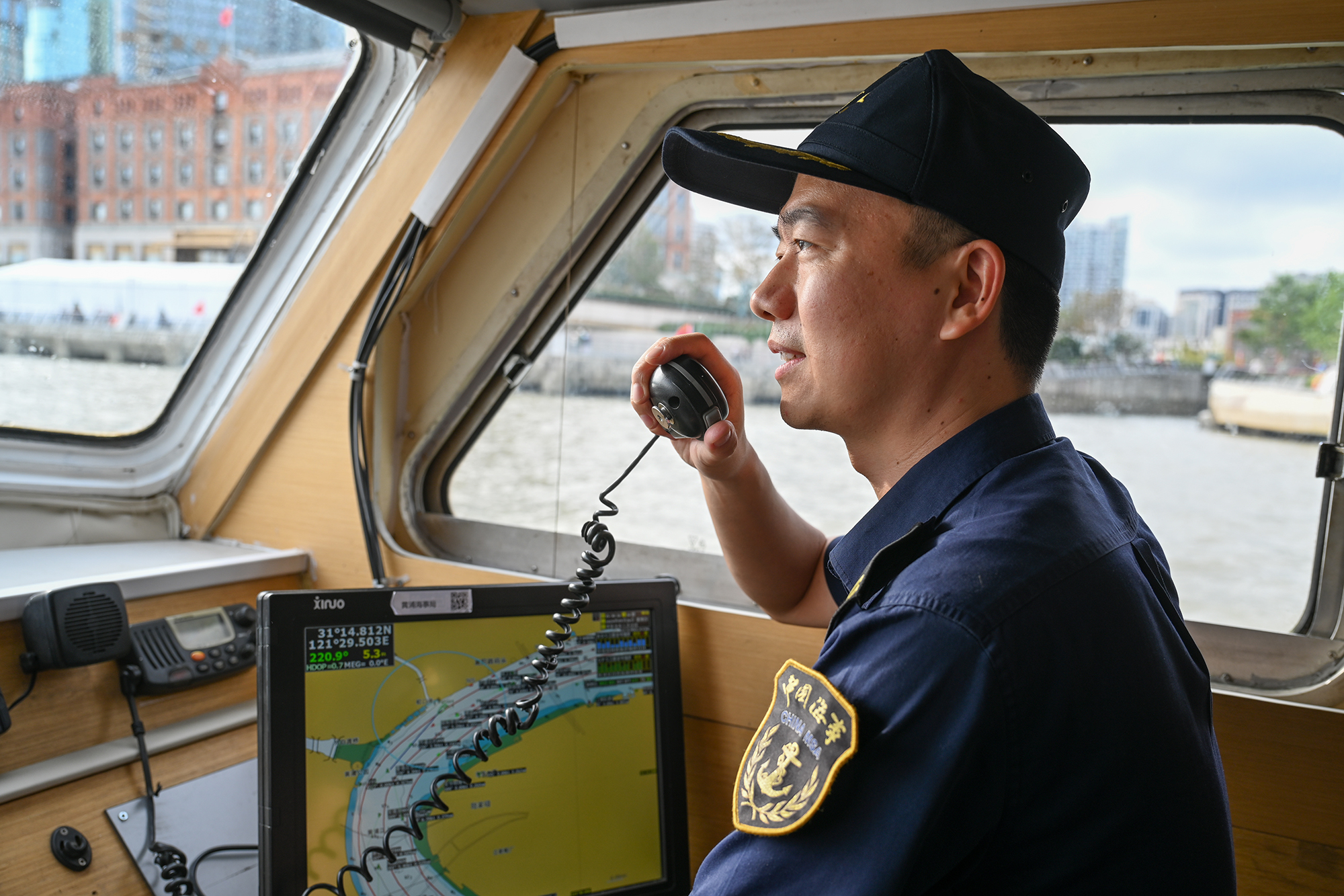 2024年9月26日,上海、黄浦海事检查人员通过船载高频提示游览船小心翼翼地行驶。本报记者 朱伟辉 图
