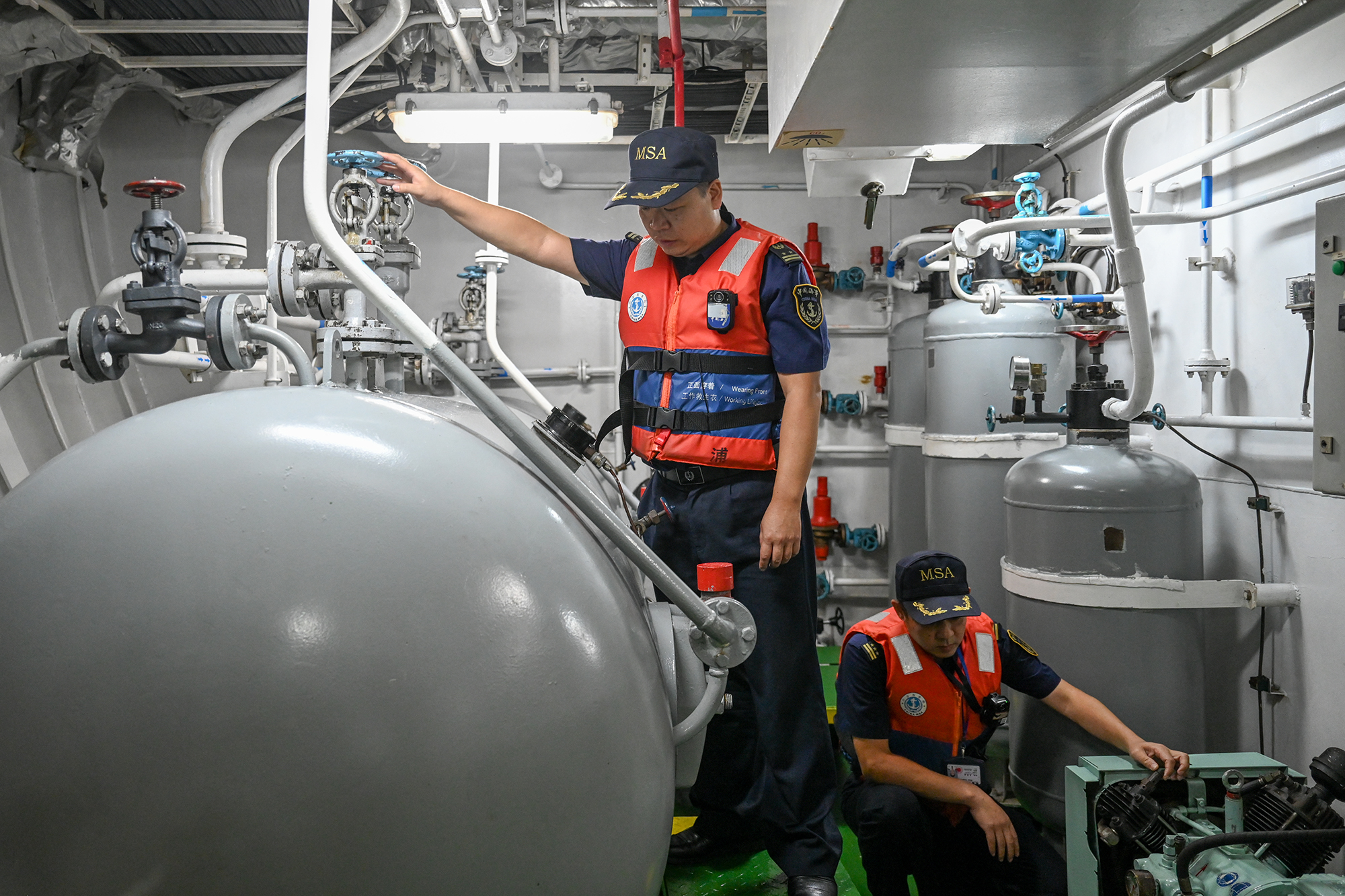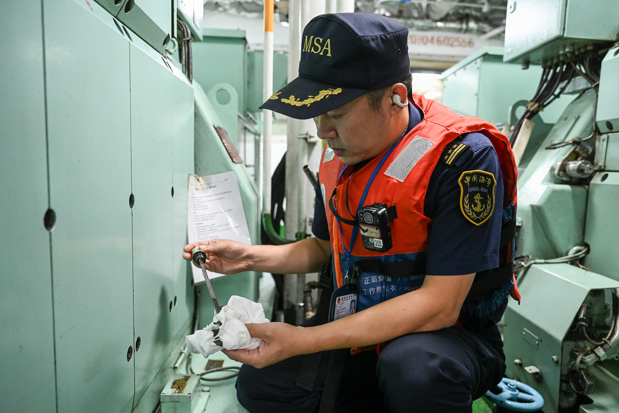 上海、黄浦海事检查人员于2024年9月26日对机舱进行检查。本报记者 朱伟辉 图