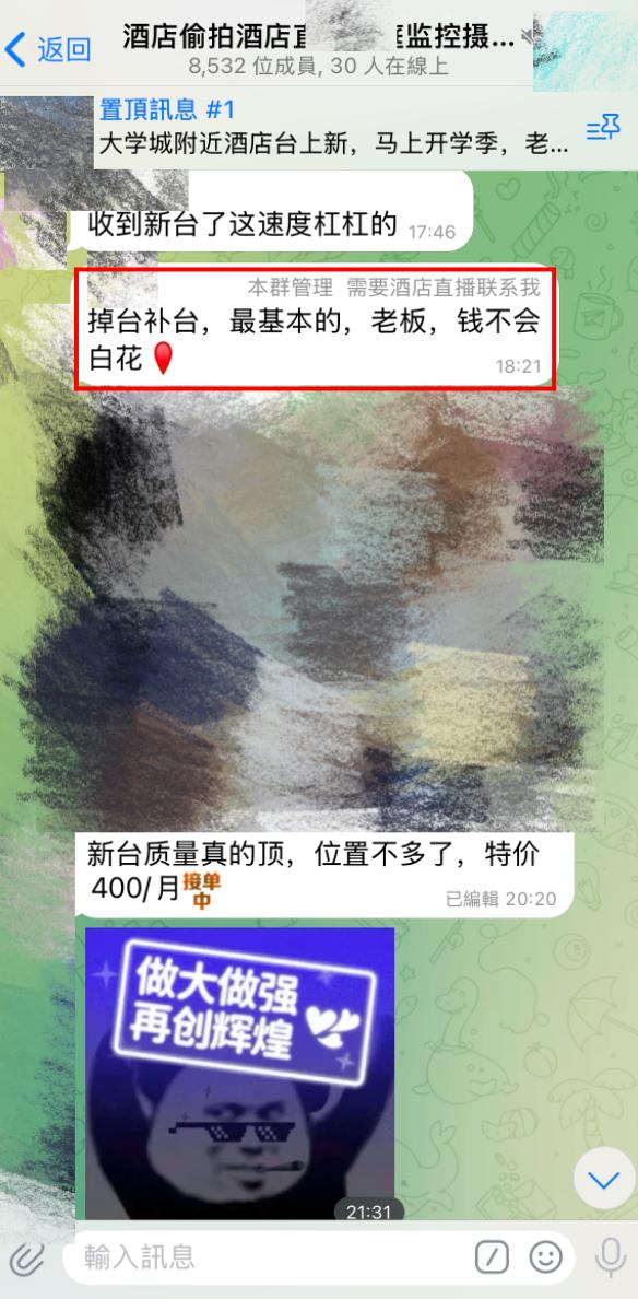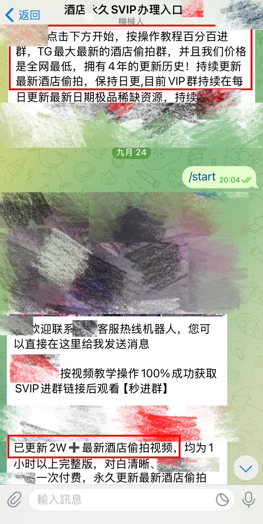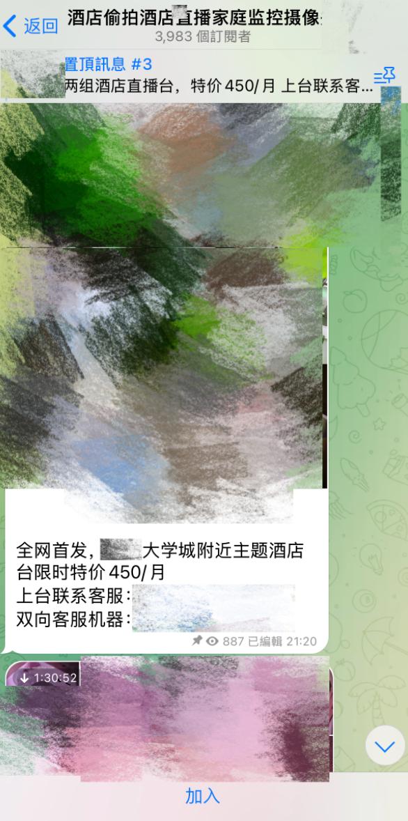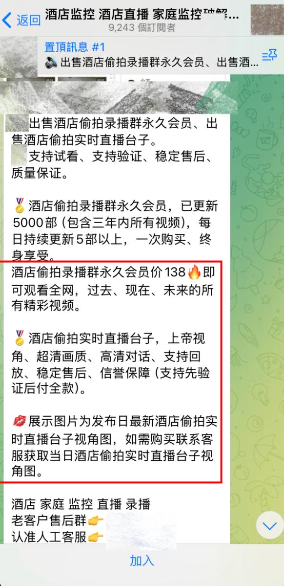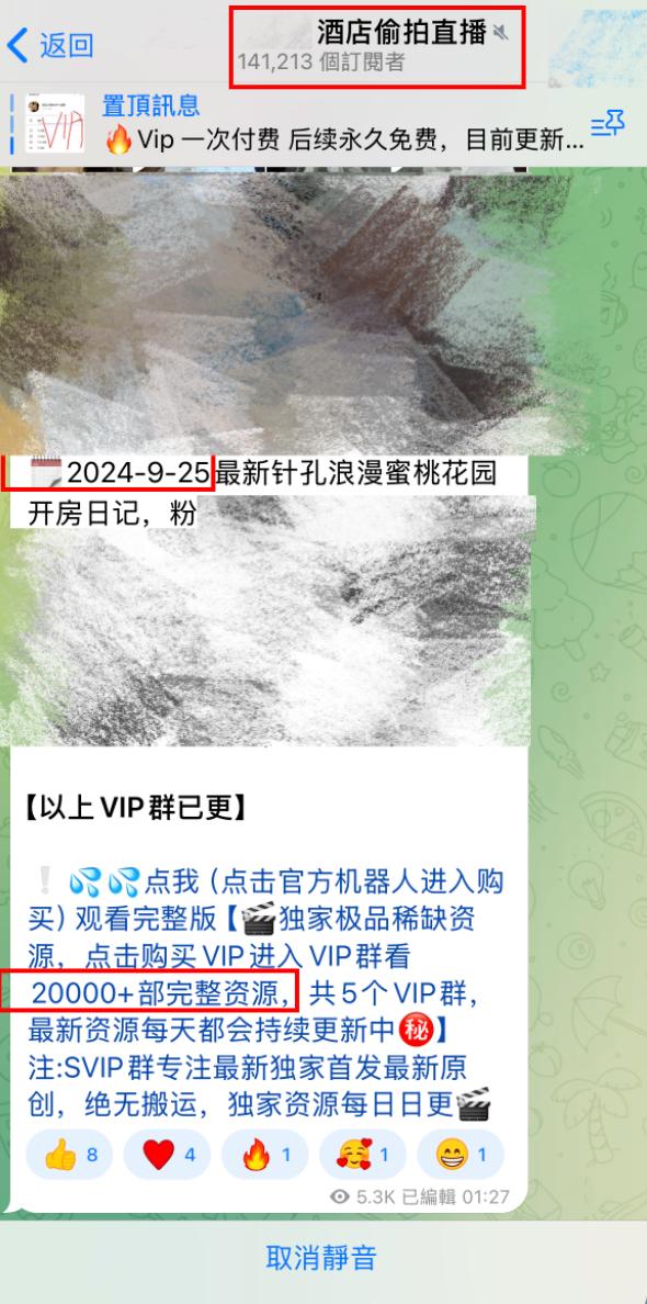 在这个频道最新的群广告中,他们声称VIP群酒店偷拍的视频数量已经从三个月前的近1万部变成了2万部。 部。