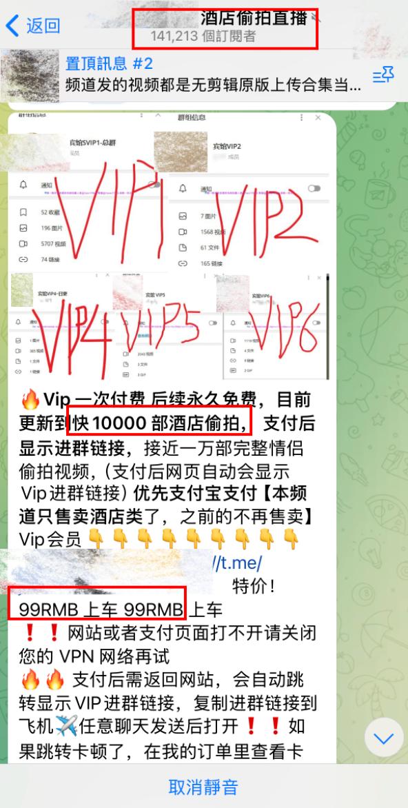 就在这个超过14万订阅的酒店偷拍直播群里,策划者声称他们至少有5个VIP频道,支付99元可以开通VIP资质,根据今年6月的小组公告,将近10000家酒店的偷拍视频更新。