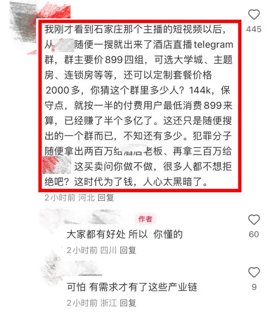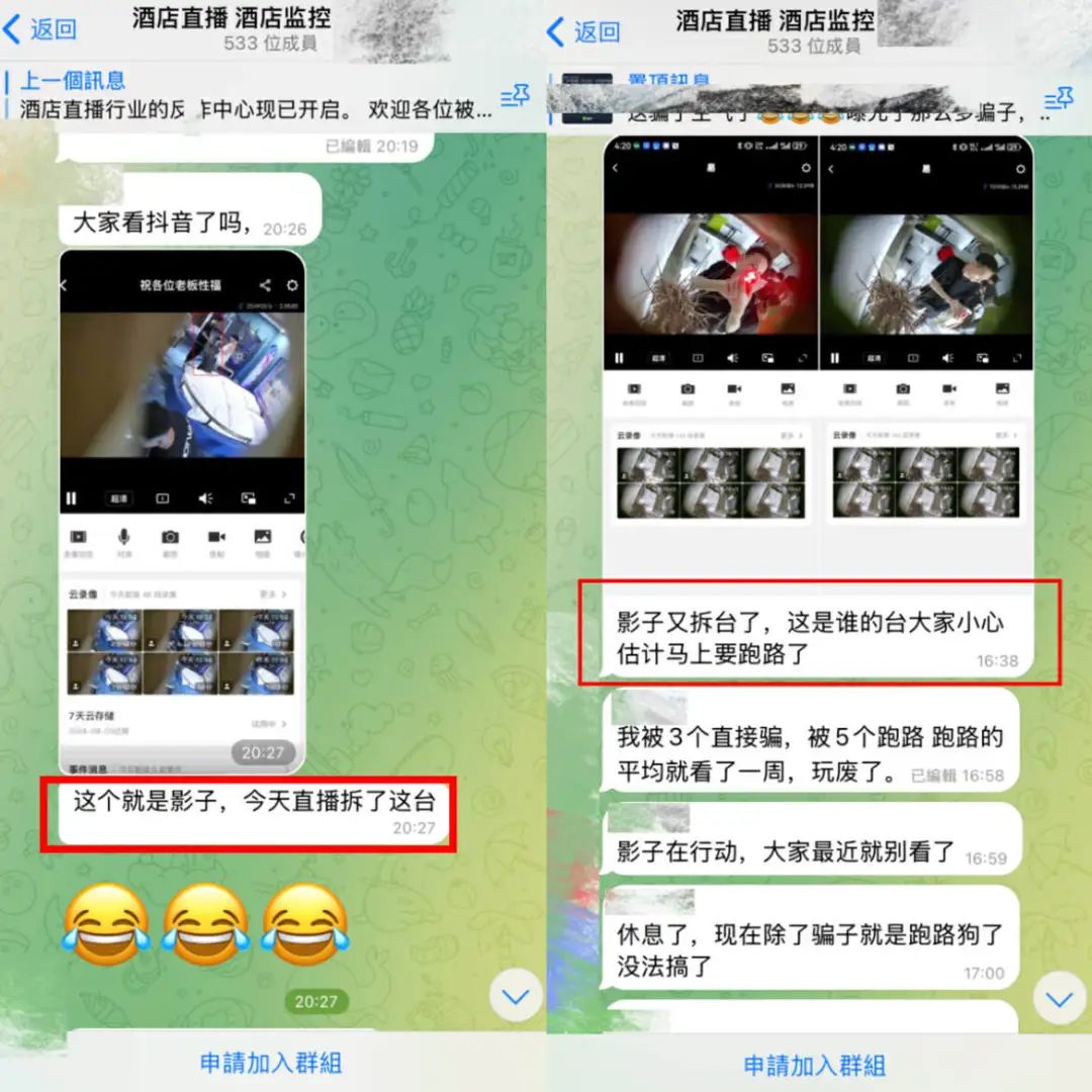 暴利是诱惑人疯狂拨动犯罪手枪的机器。这些致力于酒店直播的频道和群内观众的猖獗程度如何?简单来说,就是令人发指。