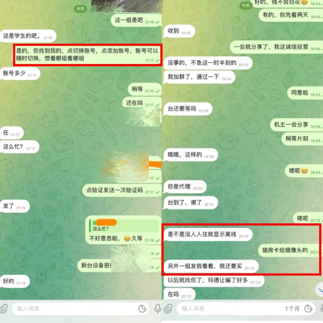 与此相对应的是“补充平台”——组织频道的犯罪分子在包月内购买的偷拍直播摄像头无法登录后,会重新发放类似位置的摄像头地址。甚至在旧址重新安装并打开一个。