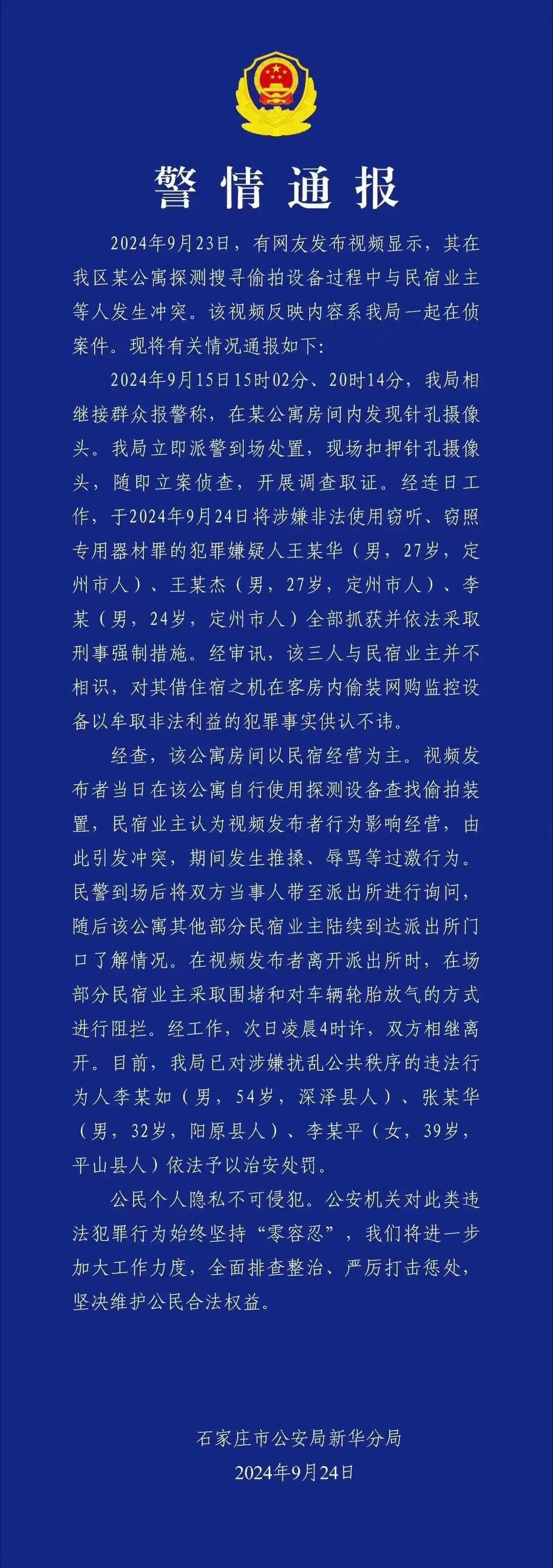 截至目前,石家庄市公安局新华分局已发布官方报告,安装针孔摄像头的犯罪分子已被抓获,涉嫌扰乱公共秩序的民宿业主已被依法处罚。