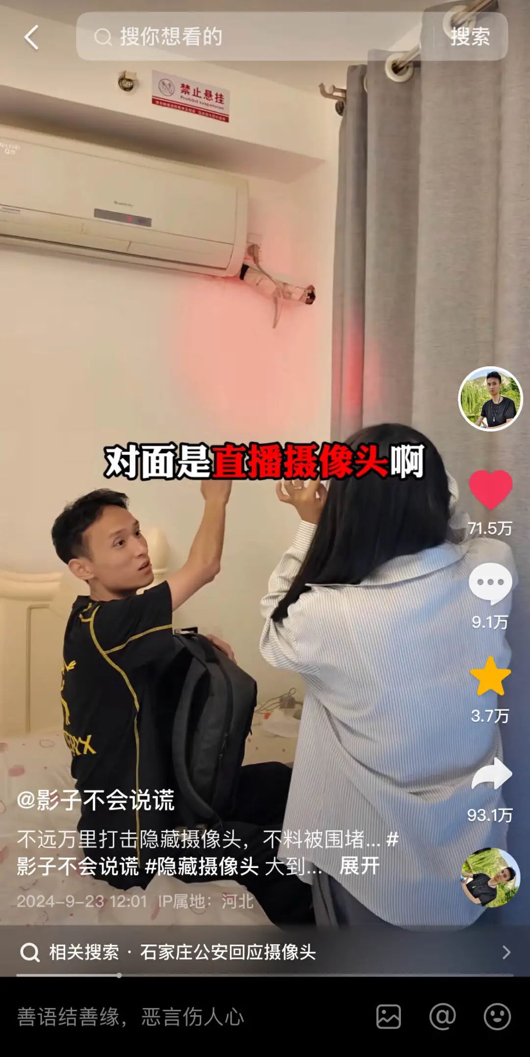九月二十三日,自媒体博主“身影不会说谎”,曝光了河北石家庄某广场酒店民宿发现多个隐藏摄像头的视频。