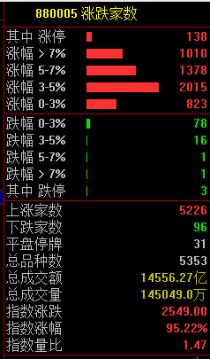 市场上有5226只股票上涨,138只股票上涨,96只股票下跌。