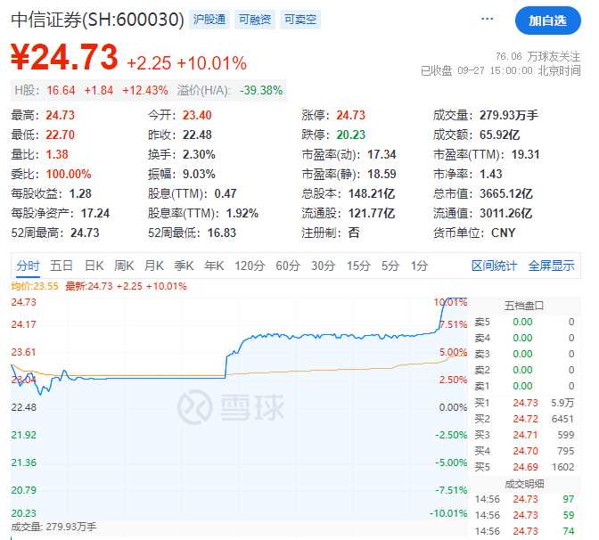自2023年7月28日起,券商龙头股票中信证券尾盘涨停,成交额超过65亿元。