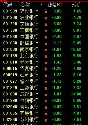 在下跌方面,银行股萎缩下跌,农业银行、工商银行、建设银行下跌超过3%。