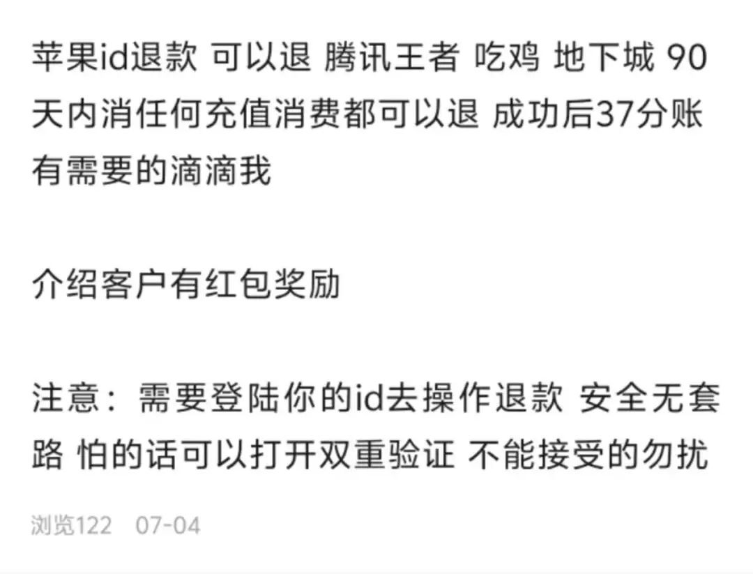 不只是电子商务,游戏退款也很赚钱。一位玩游戏退款的“个体户”胡盛华告诉Tech星球,他主要从事苹果ID退款,每天都会有不少于5-10单的退款单,退款价格从几十到几万不等,可以帮助用户退回苹果手机消费游戏充值,收取30%的佣金。这类需要退款的用户,大部分都是有充错,或者是没有消费。根据胡盛华的说法,每天的收入在300-500元左右,一个月可以超过一万元。