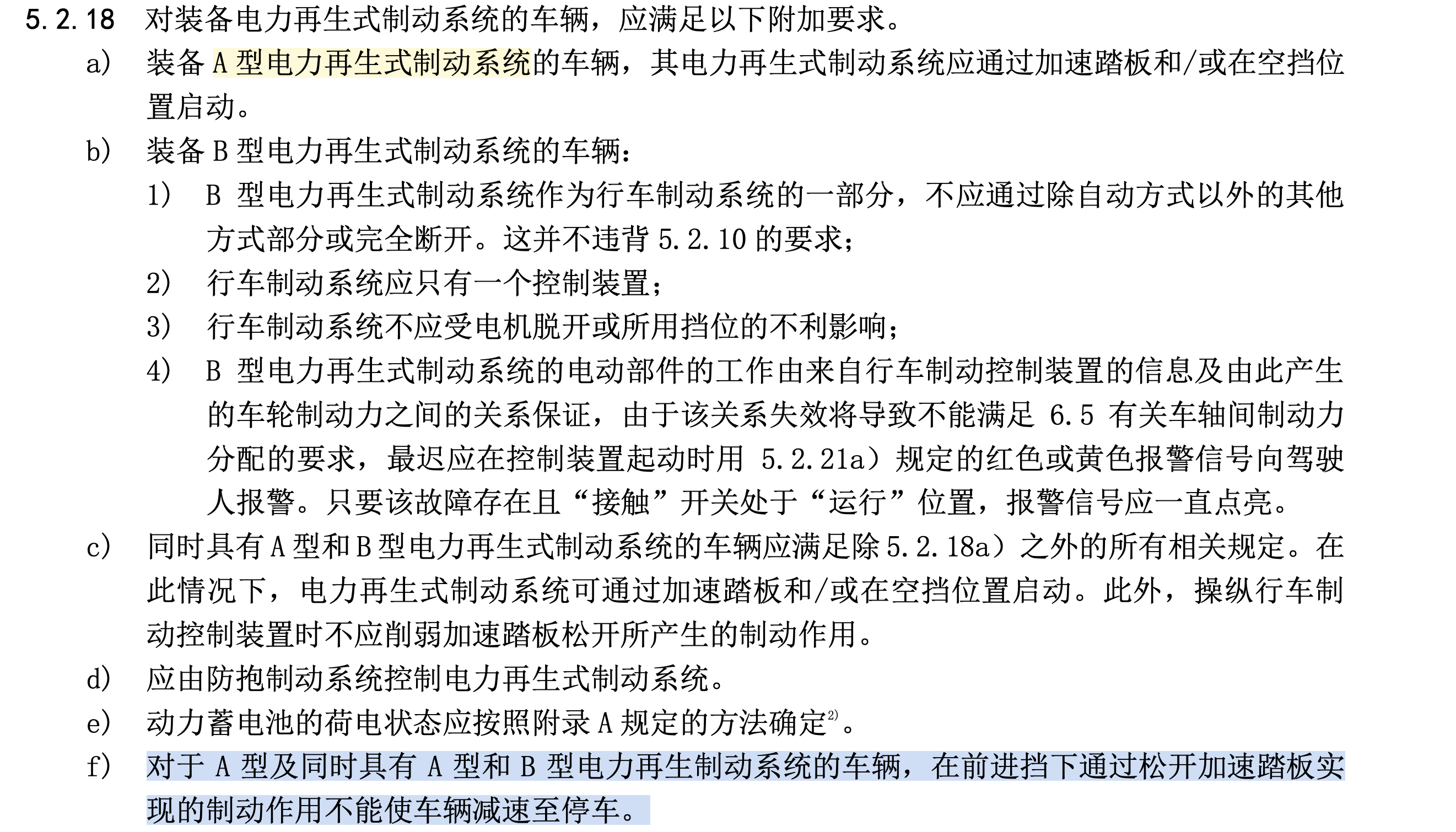 本来是为了驾驶安全而制定的规定,而小通注意到,在最近发布的新意见稿中,工业和信息化部对“禁止汽车单踏板完全刹车”的内容进行了调整。同时拥有A型和B型电力再生制动系统的车辆应满足以下要求:
