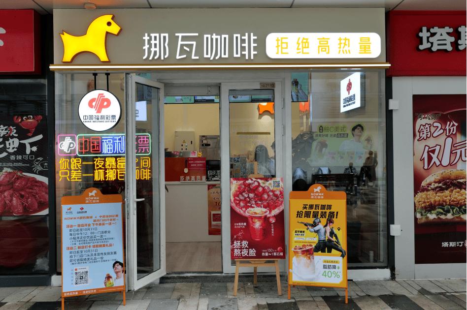 就店铺类型而言,该店属于挪瓦咖啡旗下的快取店,面积30%。㎡在那里,商店里只有少量的座位。门上挂着品牌标志性的橙色小马,左玻璃上挂着福彩的象征和名字,显眼的地方用彩灯标注着“你和一夜暴富之间只有一杯挪瓦咖啡”的口号。