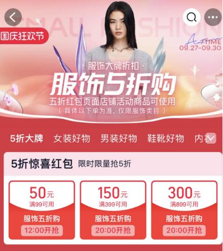 但是有趣的是,淘宝和JD.COM今年九月直接拿出来。 5 折叠促销游戏。JD.COM先起头,9 月 19-25 日,京东服装整场 5 折叠。淘宝马上就在那里 20 日跟上动作反击,天猫服装推出秋冬服装新品会场,也是整个会场, 5 折。