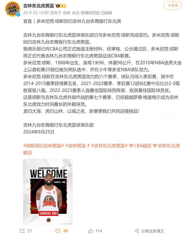 北京时间 9 月 25 日下午,CBA 正式宣布,吉林男篮:多米尼克 - 琼斯将重返球队,本赛季将出场。 CBA 联赛。琼斯真是连轴转,他刚带领中国香港金牛篮球俱乐部夺冠。 NBL 联赛冠军。琼斯平均场均 29.4 分 5.2 篮板 6.8 助攻 1.6 断球,荣获 FMVP!