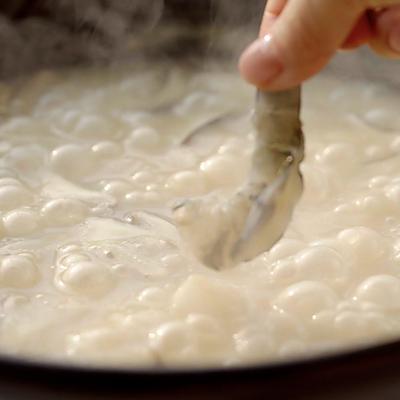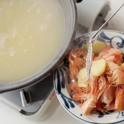 5、取出虾头虾壳和姜片,将大米放入虾膏汤中浸泡,继续煮熟。 30 一分钟,直到大米变软变粘。如果半途而废感觉太粘,可以加适量的热水。