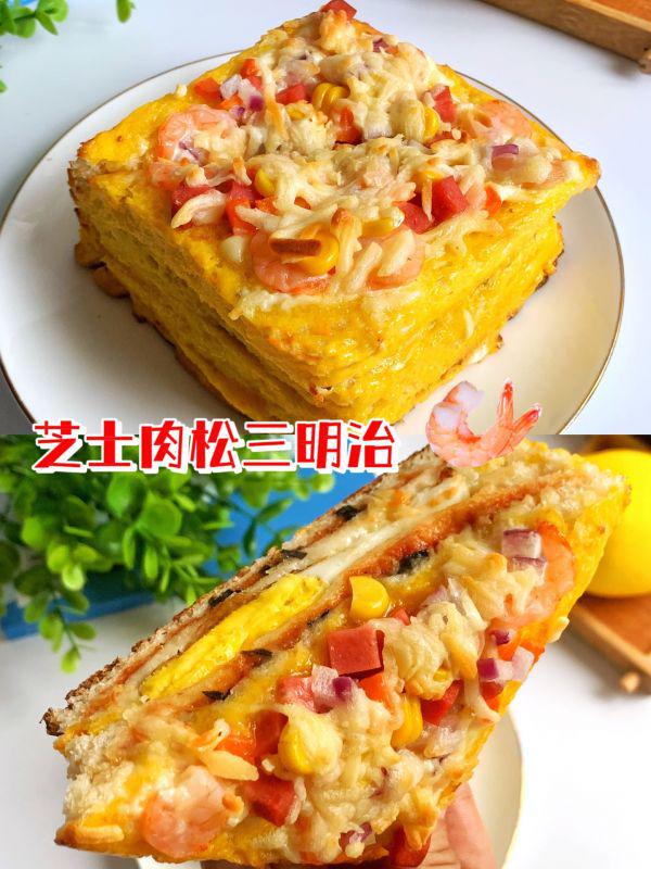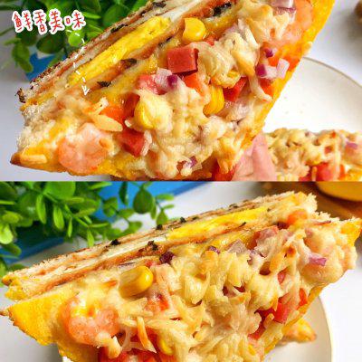 分享一份美味的家庭早餐~吐司奶酪肉松三明治,虾的美味,火腿丁的肉香,蔬菜丁的营养,玉米的香味,奶酪的拉丝...材料很好吃,超级简单,零失败。如果你喜欢它,你必须尝试它。