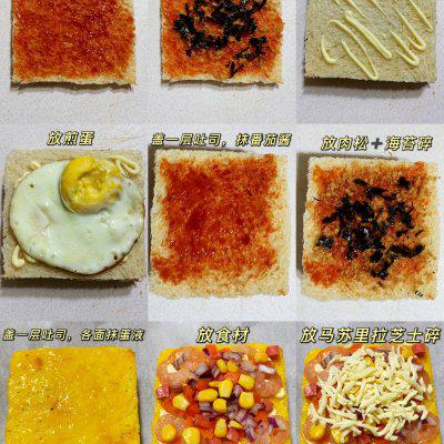 2、取一片西红柿酱➕放肉松➕海苔碎了,盖上第二片吐司,挤上色拉酱➕煎好的蛋饼,盖上第三片吐司➕抹番茄酱➕放肉松➕将海苔切碎,盖上第四片吐司。➕各面抹蛋液➕放虾仁➕放火腿丁➕放玉米➕放胡萝卜丁➕打碎了马苏里拉奶酪。