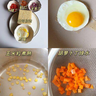 1、准备食材,将吐司切掉四面,煎一个蛋饼,用玉米煮,用胡萝卜丁焯水,清理虾仁,加入少许胡椒粉和盐腌制。 10 分钟。