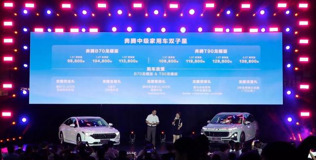 9 月 26 日,新款奔流 B70/T90 双星版龙耀版同步上市,其中奔流版 B70 龙耀版售价 9.88-11.38 万元,奔流 T90 龙耀版售价 10.88-13.88 万元。另外,官方还宣布推出五重龙耀礼,包括:限时 1 万元现金购车补贴,000元 首付 5 年度贷款较长,限时无上享受 3 万元置换补贴,全车终身保修 5 年度免费机油及 3 每年免费娱乐流量。