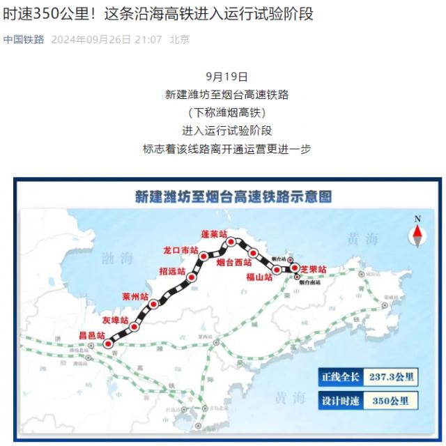 IT 世家 9 月 27 据国家铁路集团官方公告,新建潍坊至烟台高速铁路(IT 家注:以下简称潍烟高铁) 9 月 19 每天进入运行试验阶段,意味着线路离开运行更进一步。