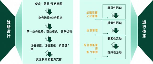 要想清楚战略设计之后,就需要通过公司的具体操作系统来实现。运行系统包括四种活动,即上图中的右半部分。它是我在《管理架构师》一书中建立起来的。