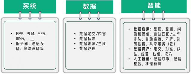 (1)系统。这是一个专门针对信息系统的系统,这更符合我们普通企业的认知。企业是否有系统?上面有哪些系统?正是这个意思。一些企业叫 IT 技术结构,就是软硬件的集成。该软件嵌入硬件中,用于实现某一系统功能。另外,除软件外,系统还包括硬件,如服务器,网线等。最近看了一本叫宁振波的书。这本书的标题是《智能制造的本质》。上面列出了几十个系统,比较简单。 ERP、PLM、MES、WMS,等等。
