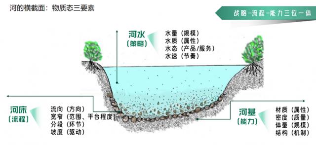就物质状态而言,我也有一些创新,提出了三位一体的策略、流程和能力。看一条河的横截面,首先是水流,就是顾客的价值。然而,起初,客户价值的初级形式逐渐成为客户价值的最终形式,最终交付给客户的是能够满足有效需求的最终产品和服务。也可以理解为,这就是客户的价值形式。价值创造的前提是经营者实践中的价值定位。换言之,顾客的价值是什么,顾客的价值主张是什么,以及如何创造价值,都是通过战略来决定的。衡量河流的指标主要有: