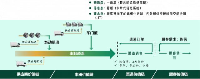 丰田的这条河,不断地导出各种颜色、各种规格的汽车。它有一个主要的制造流,两个支流,即发动机流和车门流。并且有许多流量与供应链相匹配。它的水流到哪里去了?通过流入经销商的渠道。在第二次大战之后,丰田曾经很困难。只有经销商确定订单后才敢排产。交货时间越短,订单就越准确。这样,丰田就确定了 3 天交付的" T 3 "方式。显然很难完成这样的任务,但是丰田由此构成了多批次、少批次、快节奏的大规模定制模式。