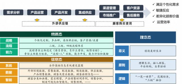 举例来说,制造企业的价值流程(图表 12)从需求分析、内容操作(包括产品规划、产品生命周期管理)、产品开发,集成供应,到渠道,推广,客户资源管理,再到售后服务…这个流程需要满足个性化的要求,需要敏捷的反应;要能够创造差异化的客户价值,并且具有运营效率。所以,它的物质状态应该具有什么特点?信息状态应该具有什么特点?概念态度应该具有什么特点?图 12 作了说明。有了这样的蓝图,我们的战略和管理就结合在一起了,我个人认为这可能是一个比较。 BLM 更好的打通方式。由于 BLM 这里没有操作,只有关键任务。像华为这样的公司在将 SP(战略规划)转换为 BP(年度经营计划),使用平衡记分卡,这样就包含了操作。