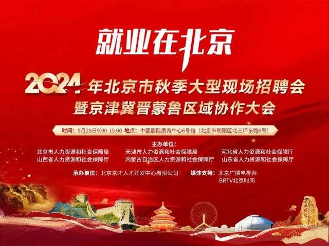 9 月 28 日," 2024 在中国国际展览中心举行的2008年北京市秋季大型现场招聘会暨京津冀晋蒙鲁区域合作大会。本次招聘活动采用“现场招聘” 直播带岗 网上专场“聚集用人公司”方式 200 家庭,提供超级就业岗位 1 万只,现场设置不同地区、不同领域的六大招聘区,为众多应聘者和用人单位搭建精确对接平台。详情>>>