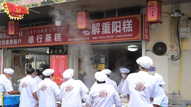 "我们现在正在生产蒸糕 2000 多份,预估 10 月 8 日至 11 销售高峰即将到来,蒸糕每日销售。 5000 份上下。“店主、徐行蒸糕非遗传传承人解荣光介绍,由于今年重阳节临近国庆节,蒸糕销售高峰期从 9 月 22 日期已经开始,比往年提前一个星期左右,微信和电话订单已经排到了第一位。 10 月 11 日重阳节当天。