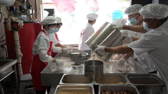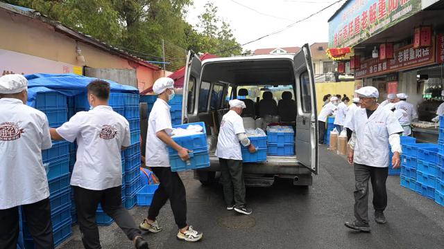 店外,一堆堆蓝色的集装箱里装满了蒸糕,一个人被建造得很高。过了一会儿,几十个集装箱的蒸糕装运出去了,空的地方很快就被新做的蒸糕填满了。