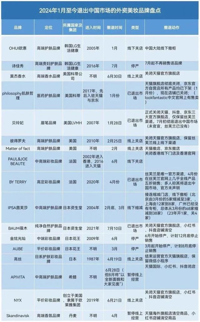 据《联商网》不完全统计,2024 到目前为止,年已经存在17 一个外国美妆品牌宣布关店或撤销。