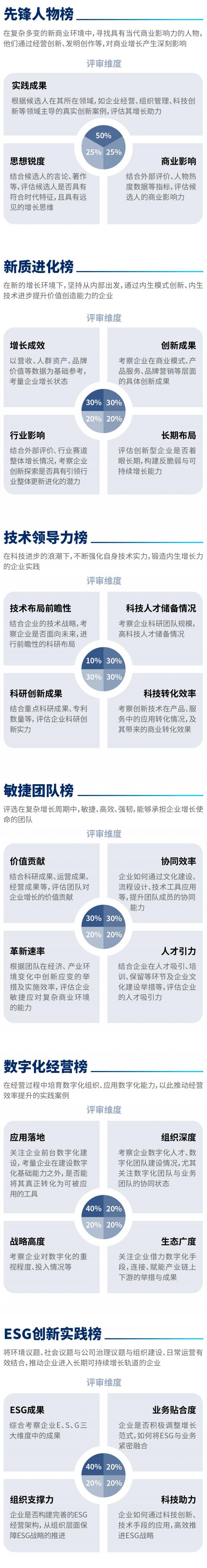 紧跟商业趋势,基于创新的增长实践案例和真实的商业表现,从更客观、更科学的角度寻找标杆商业人物和案例,是设置新增长名单的初衷。2024年,结合过去一年对企业增长实践的观察和对未来一年增长趋势的预测, 年度中国新增年度榜单更新类别,将评选出 “中国的新增长 · 先锋人物榜"“中国的新增长 · 新质进化榜"“中国的新增长 · 技术领导力榜"“中国的新增长 · 敏捷团队榜"“中国的新增长 · 数字化经营榜"“中国的新增长 · ESG 创新实践名单"6 大分项列表。