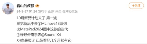 这位博主发表了一篇文章: 10 月亮新产品计划来了,第一波感觉新产品不多:ML nova13 系列;MatePad 2024,即图中这款的迭代;绿野传奇手表;Sound X4,X4 还服了,已经看了好几个月了。“从它所透露的信息中不难看出,华为将会到来。 10 月带来新机 nova 13 系列、新的 MatePad 2024 平板电脑,新绿野传奇配色手表,新音箱。