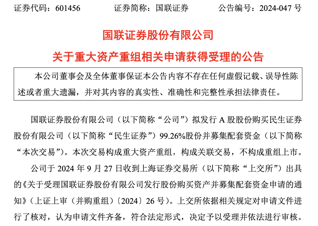 9月27日晚,国联证券发布《关于受理重大资产重组相关申请的公告》,称收到上海证券交易所发布的《关于受理国联证券股份有限公司发行股票购买资产、募集配套资金申请的通知》。同时,证监会网站上悄然更新了几项相关国联证券和民生证券的行政许可申请。