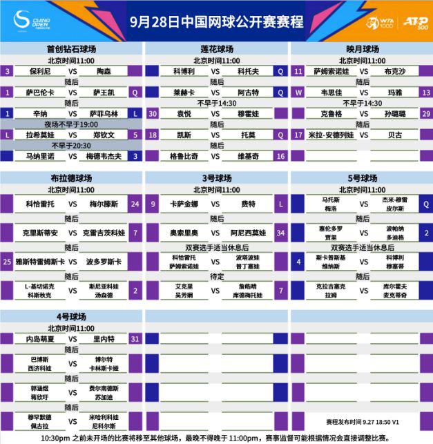 9 月 28 日中网重要比赛(比赛时间均为预期时间)