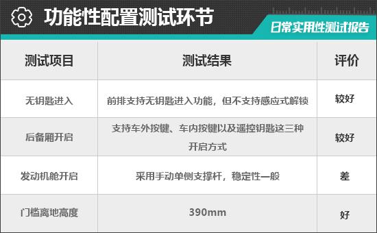 对消费者而言,门槛离地高度在一定程度上决定了上下车的便利性。根据实际测量结果,对汽车门槛离地高度的评估 在测试过的同级别车型中,390mm处于上游水平,驾驶员每天上下车非常方便。