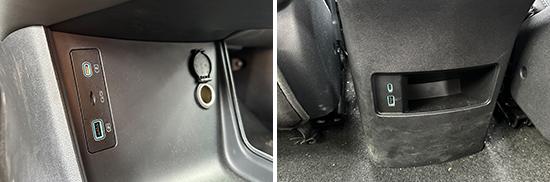 对车前配置进行评估 1 个 USB Type-C 接口和 1 个 USB Type-A 接口,全部位于中控台下方;后排也配置 1 个 USB Type-C 接口和 1 个 USB Type-A 接口,位于空调风口下方,布局合理,兼容性好。另外,前排中控台下方还提供 1 个 12V 电源接口,能满足车内乘客多种电子产品的用电需求。