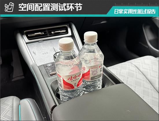 对车内使用空间的检测,仅针对前排触手可及的空间,不包括手套箱、中央扶手箱等需要启动的空间。测试方法是将以下所有固定物品放置在前排的每一个储物空间中,通过固定物品的放置状态来判断车辆储物空间的性能。检验选定的固定物体如下:2 一瓶常规大小的矿泉水, 大屏幕手机,1 支口红、1 个挎包、1 副墨镜、1 把折叠伞和 1 包装常规尺寸的抽纸。