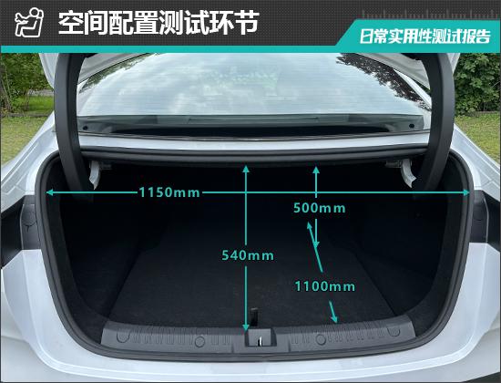 后备箱内部形状整齐,地板平面度好。此外,后排座椅的支撑比例放下,放下后可以进一步扩大后备箱空间。我们还实际测量了汽车后备箱的基本值,开口长度为 540mm;张口宽度为 1150mm;后备箱进入深度 1100mm;后备箱台与上面的垂直高度为 500mm。