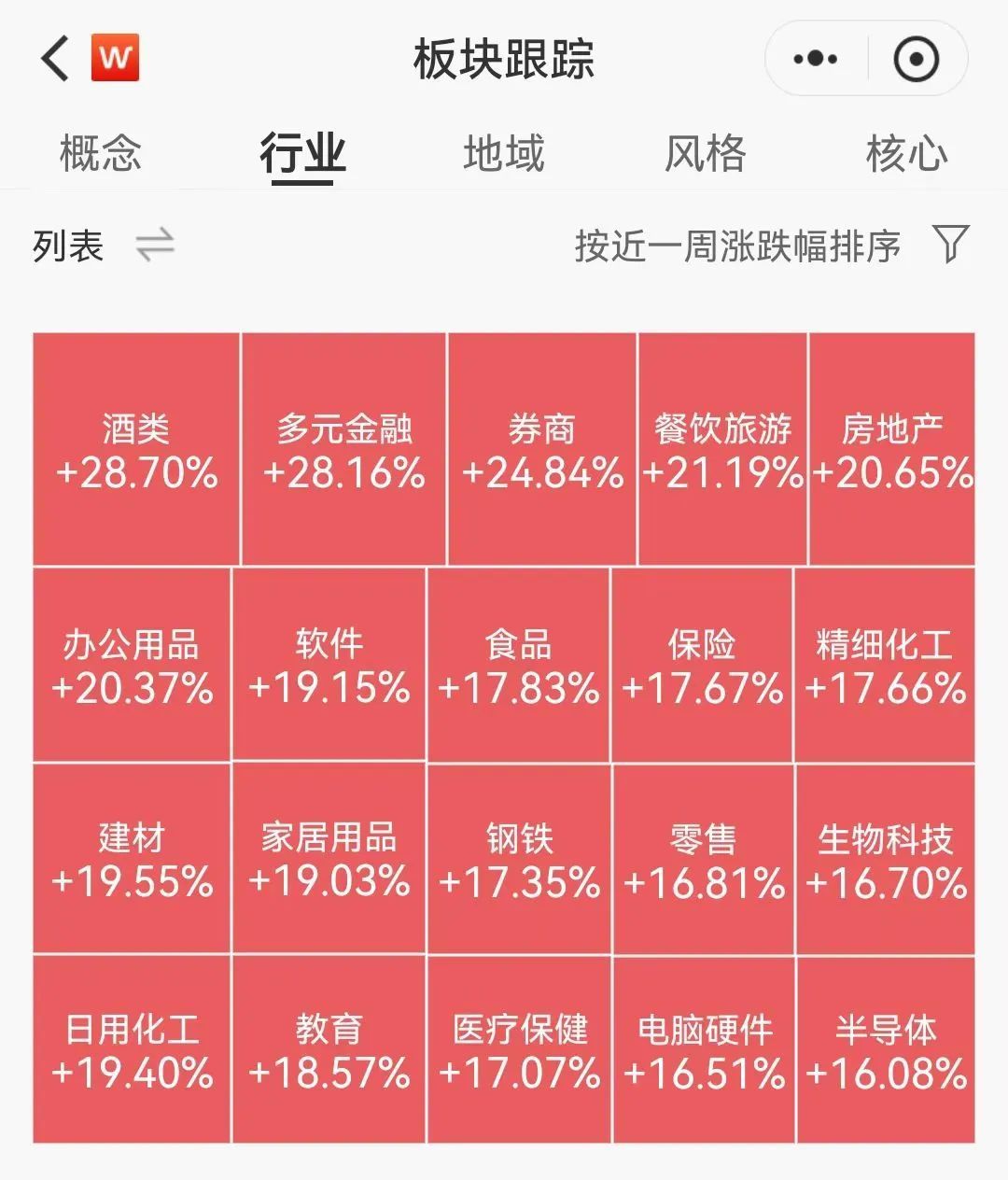 本周,所有行业均大幅上涨,饮料、多元金融、券商、餐饮旅游、房地产等6个行业周涨幅均超过20%。